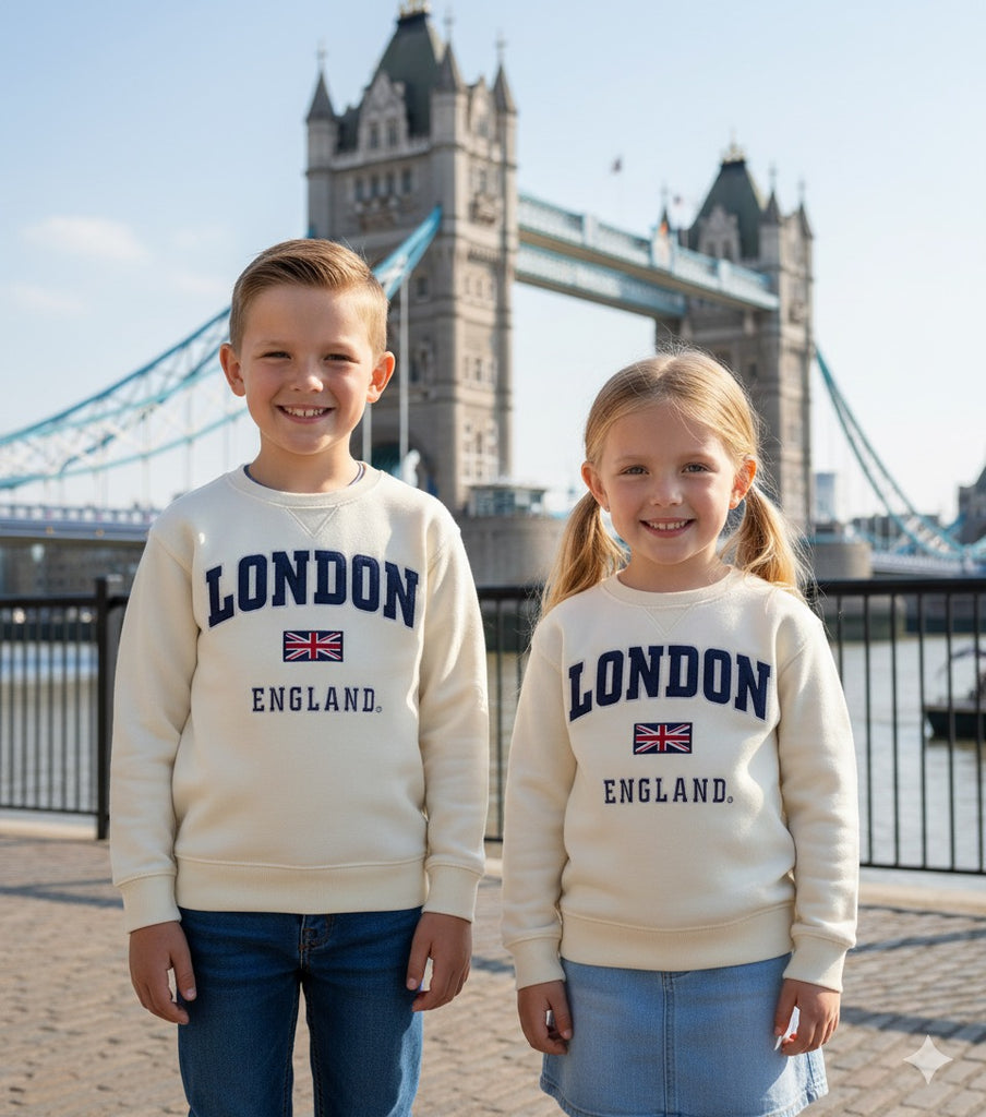 Kids London England Sweatshirt Off White Sizes 1 to 13 Years, with Union Jack Metal Pin Badge