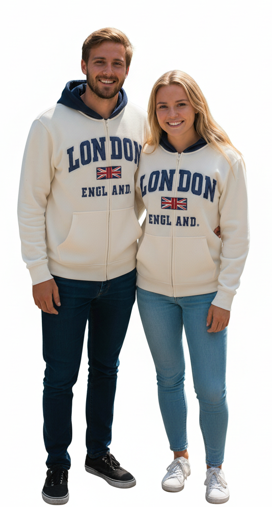 Show your British pride with this classic London England zip-up hoodie, featuring a prominent Union Jack metal pin badge that adds an authentic touch. The comfortable sweatshirt showcases bold 'LONDON ENGLAND' embroidered lettering, making it perfect for casual wear or showing support for British culture. Available in stylish colours - Off White Navy, - this versatile hoodie suits various style preferences. The full-zip front design offers easy wear, while the drawstring hood and kangaroo pockets provide practical functionality. Crafted with attention to detail, the hoodie features ribbed cuffs and hem for a snug fit. The inclusive size range from XS to 4XL ensures a perfect fit for everyone. This cosy hoodie is ideal for year-round wear, whether you're exploring the city streets or relaxing at home. The classic design makes it a wardrobe staple that pairs effortlessly with jeans, trainers, or casual wear. sizes available Fabric 50% Cotton 50% Polyester, weight is soft heavy 300GSM Chest 19 inches (50CM) Length 25 inches (65CM) S Chest 20 inches (52CM) Length 26 inches (66CM) M Chest 21 inches (55CM) Length 27 inches (68CM) L Chest 22.5 inches (58CM) Length 28 inches (71CM) XL Chest 24 inches (61CM) Length 29 inches (74CM) 2XL Chest 25 inches (63.5CM) Length 30 inches (76CM) 3xXL Chest 27 inches Length 32 inches 4XL Chest 29 inches Length 34 inches