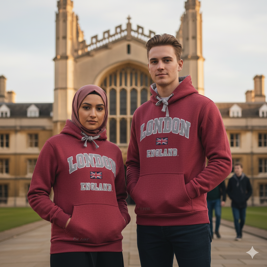 LE129 Unisex London England Applique Embroidery Hoodie Ruby Red Size XS to 4XL